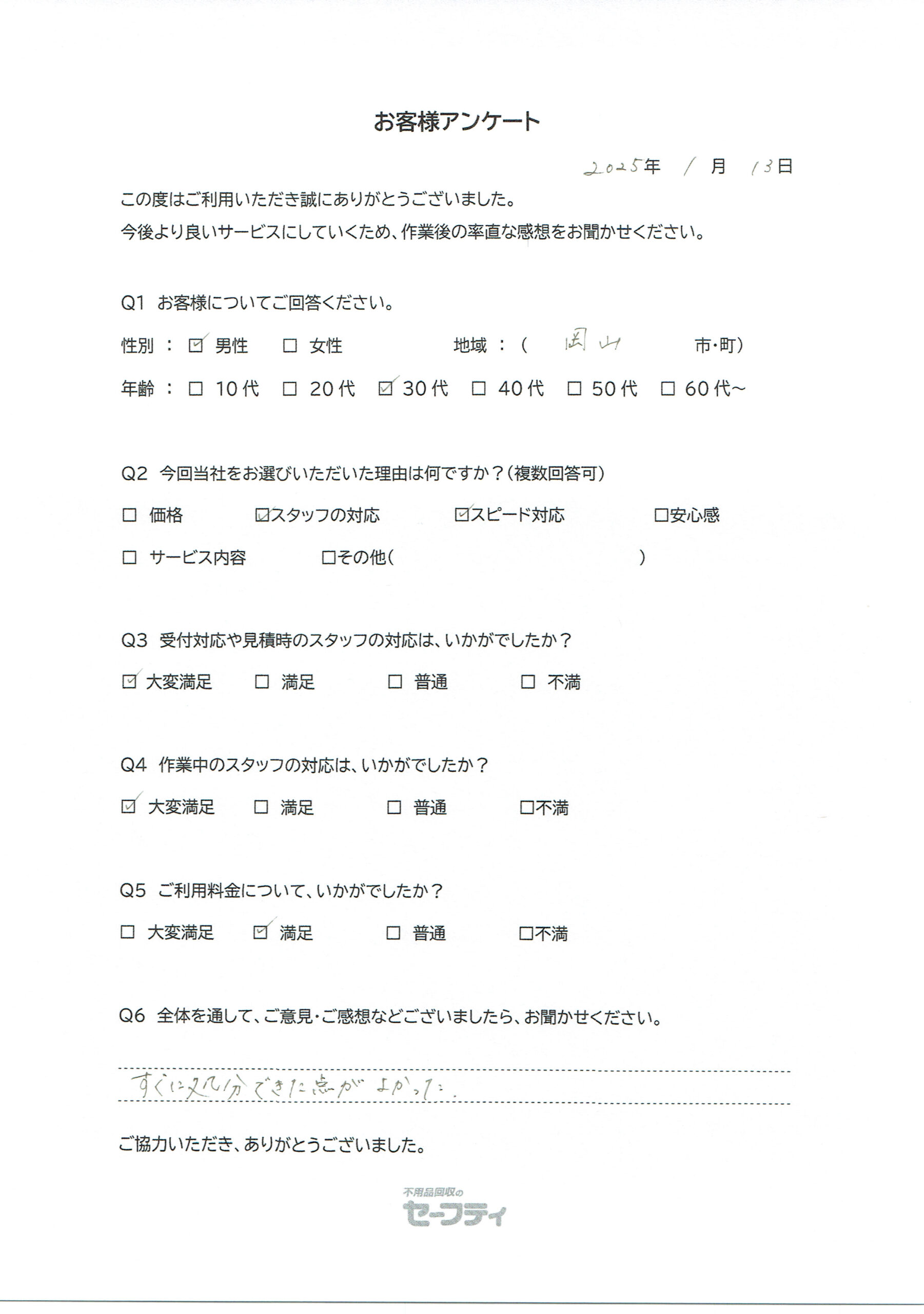 岡山市Uさま(引越しゴミ回収ご利用のお客様アンケート)