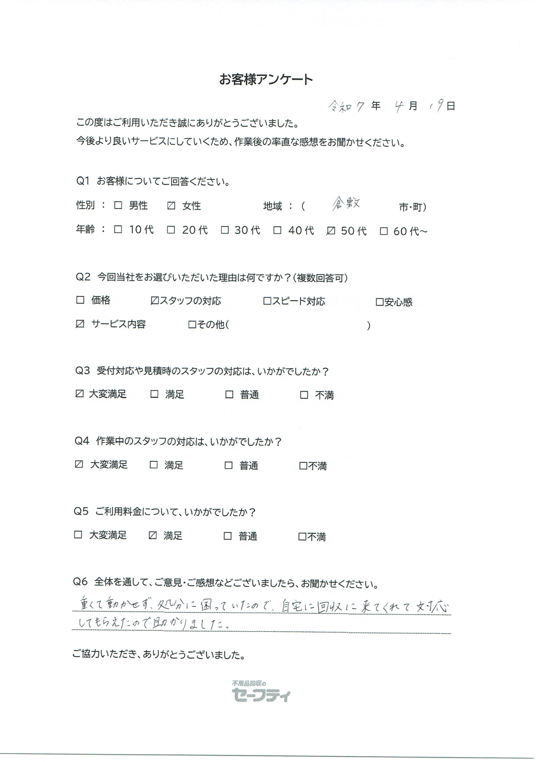 倉敷市Oさま(不用品回収ご利用のお客様アンケート)